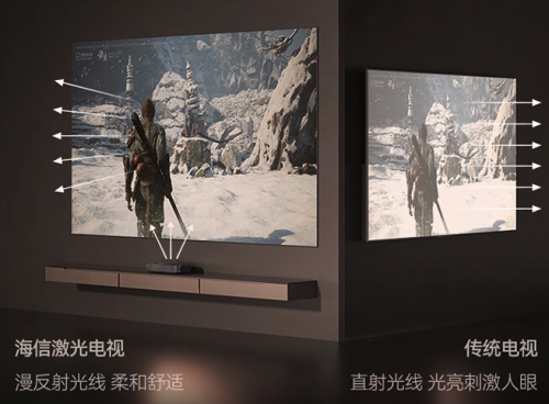同时海信激光电视采用漫反射原理成像,光线柔和,大幅降低眼部刺激,有效缓解视觉疲劳,护眼效果显著。相较于传统电视直接发光的成像方式,海信激光电视通过屏幕反射光线进入人眼,减少了光线直射对眼睛的伤害,从而实现更加健康、惬意的日常观影感受。