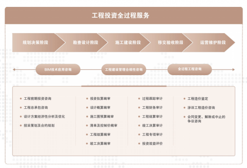 公司提供项目前期经济论证和投融资方案策划,深耕工程建设造价咨询、财务咨询、合规咨询、项目管理、竣工决算等全过程服务,助力项目科学决策、合规建设、经济实施、顺利交付。