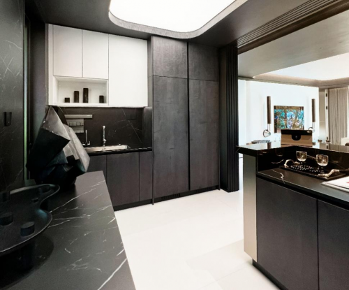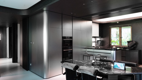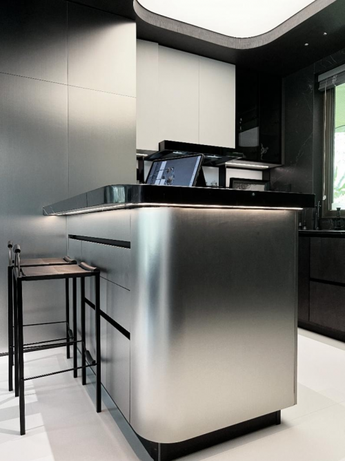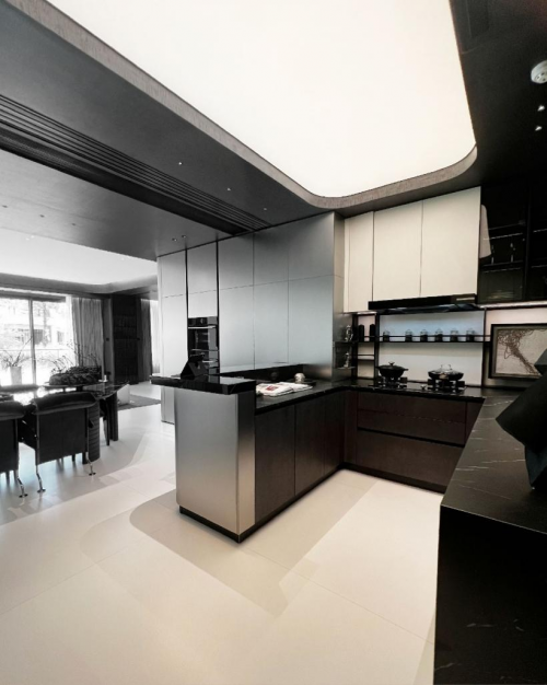 德国玛娅在麓湖生态城项目中,巧妙运用了黑、白、灰经典色调,在此基础上,将金属拉丝纹理和自然木纹巧妙结合,结合金属材料的冷峻感与木材带来的温暖触感,营造出一种既奢华又温馨的空间氛围。不仅增强了厨房区域的艺术美感,同时也让烹饪过程变得更加享受。