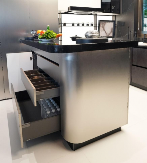 考虑到厨房作为家庭情感交流中心的重要性,德国玛娅特别注重于通过精心设计,来促进空间之间的自然过渡。采用不同材质与颜色搭配的手法,在确保足够储物空间的同时,也成功地划分了各个功能性区域,使得整个居住环境更加流畅且美观。岛台与墙角处采用圆弧艺术处理,赋予了整个橱柜系统更加柔和优雅的形象。