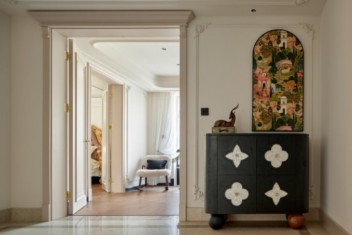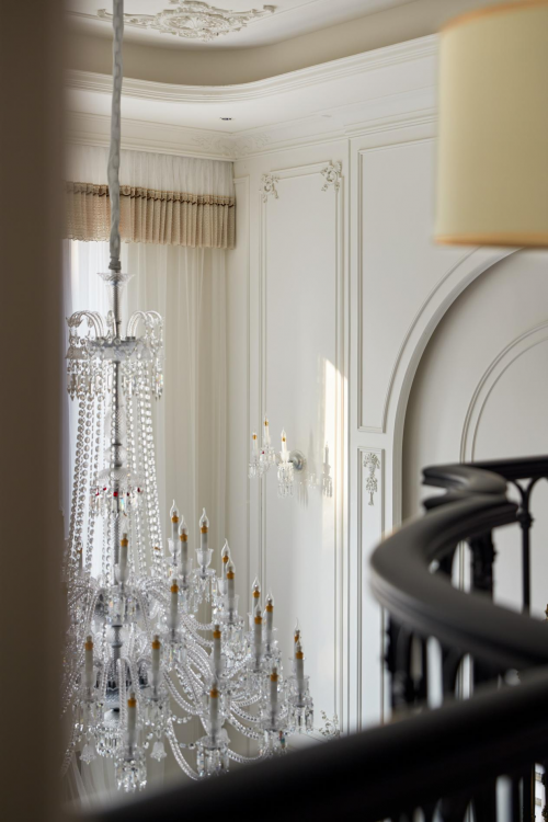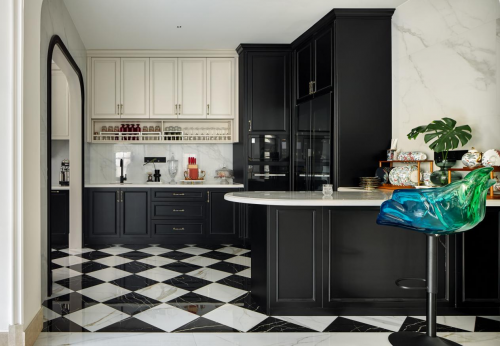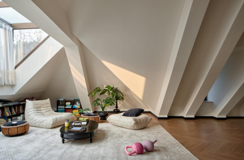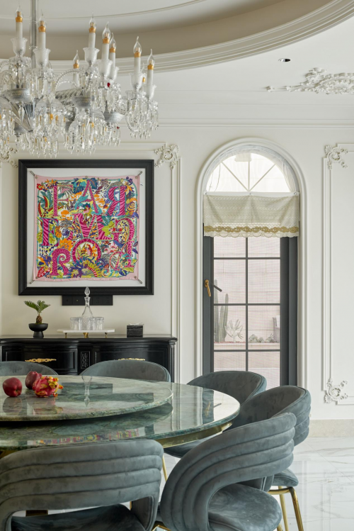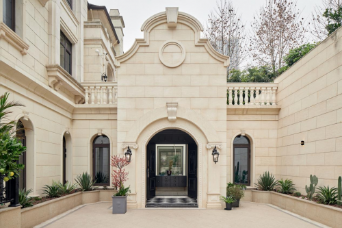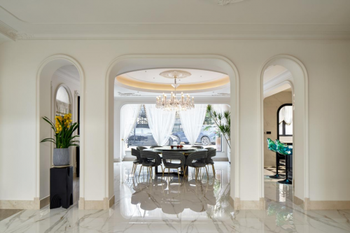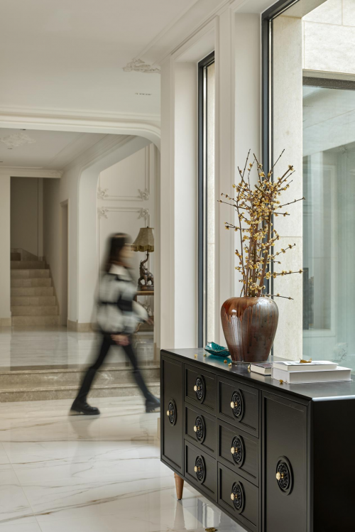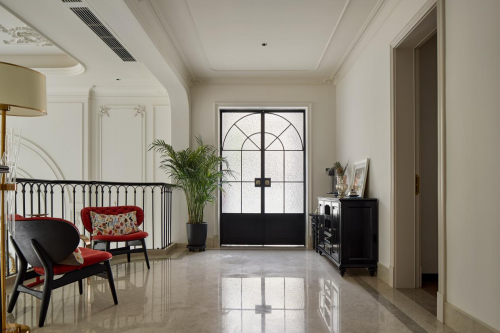 面对厚重的法式风格,选择以现代的简明线条勾勒加上细腻的奶油风调性,打造非惯性法式居所,让现代法式新生。入户玄关处,通透的玻璃直通天井打造一个绿意小空间,引入阳光,引入绿色,打造通透的空间感,勾勒出静止却灵动感的画面。