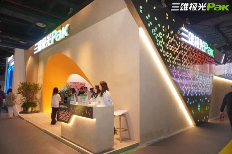 此次三雄极光展位设计理念紧扣人造光仿自然光之神奇,以阳光穿透云层洒向森林为灵感,为地球披上神秘多彩、充满希望的面纱。旨在展现光赋予世界生机,与自然和谐共生的美妙画卷。展馆外型如盘古开天辟地之神斧,肌理似森林之茂叶,在多彩绚烂的光线勾勒与衬托下更是愈发有力量,生动诠释了人向往光明的精神追求。整体采用六面建筑体,搭配多彩绚烂的灯光打造出“光照之地,生生不息”的森林意境,意寓三雄极光披荆斩棘的创业精神,同时也是我们人类为获得更健康舒适的人造光,而不断探索、研究和仿造自然光所创造光故事为脉络展开。利用智能控制变色的景观照明模组和专业的线性洗墙灯,将产品巧妙地与自然元素相融合,用光影艺术带大家回归自然。