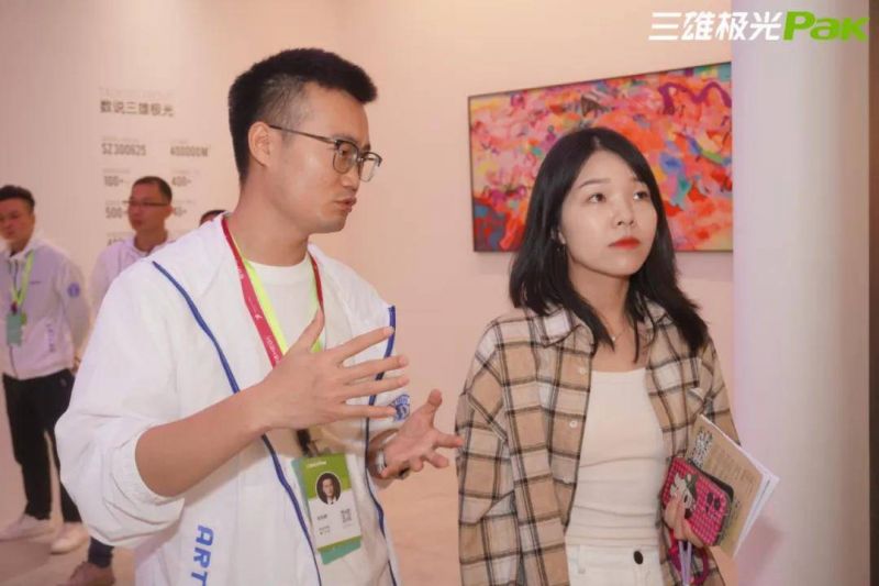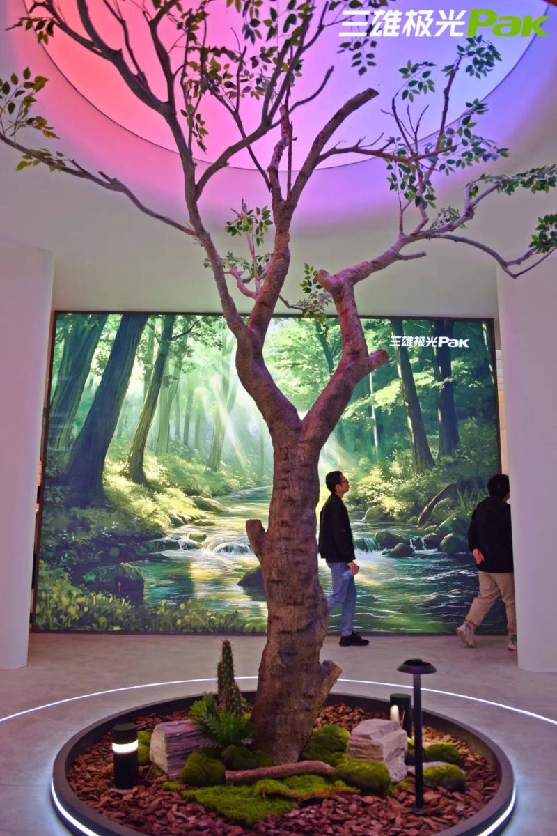 三雄极光从大自然中汲取灵感,将可持续发展理念再次延续和创新。从“穹之门”进入展馆,映入眼帘的是中央参天大树与光共舞,上圆下方的视觉效果,彰显空间层次,同时也象征着中国人的处世之道。在专业的偏光射灯和极智智能无线系统共同配合下,参观者可以沉浸光中,赏艺术画,心境自由且充满想象,仿佛置身于森林中,寻找自然的节奏。