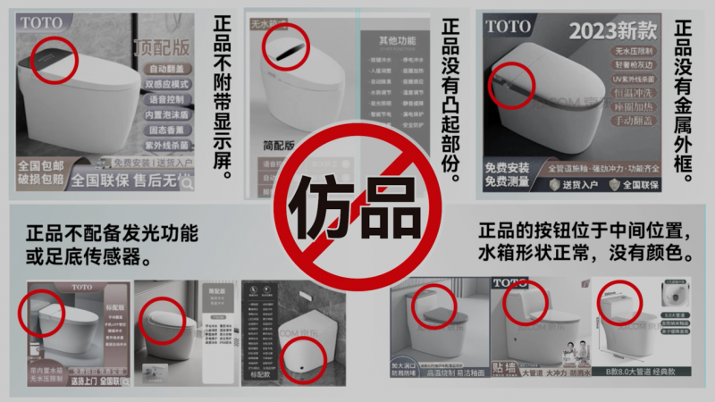 作为卫浴界的“老网红”,TOTO以其百年历史和优良品质,获得了诸多消费者的青睐,同时也引致TOTO仿冒品层出不穷。这不仅损害了TOTO的品牌形象和产品美誉度,更以劣质材料和品质威胁着消费者的健康和安全,曾经也出现过TOTO仿冒品导致购买者的人身安全和财产受损的案例。