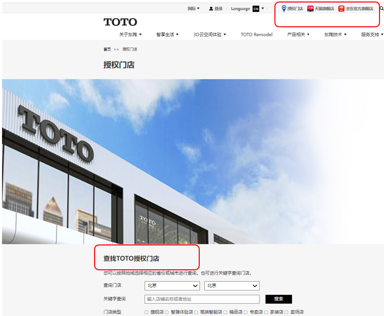 在TOTO的官方网站www.toto.com.cn的右上角可以查询TOTO授权门店或者获取官方网络店铺信息。