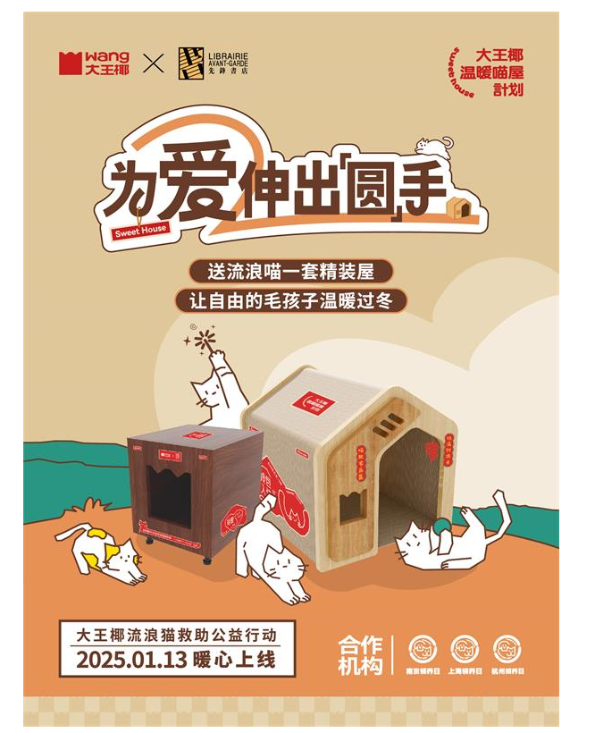 令人意外的是,这场以爱执笔的剧本,远不止于此,在呼唤爱的背后,还有大王椰如何传递爱的多样表达。1月13日,大王椰携手先锋书店于南京·先锋汤山矿坑书店举办温暖喵屋计划第二季启幕活动——喵趣签屋会,会上不仅与爱猫人士进行互动,畅谈关爱流浪猫议题,更是将这份关爱进行了实质性的传递,推出了升级2.0款和大师系列款两款猫屋,除现场随机发送外,其还在微博、小红书、抖音全平台进行线上申领,猫屋随着每一位爱心人士,发放到喵星人聚集地,帮助它们温暖过冬。
