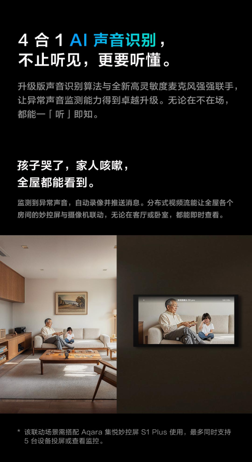 Aqara智能摄像机 G5 Pro内置本地化AI算法,无需依赖云端即可完成七合一视觉识别与四合一声音识别。例如:包裹守护:智能监测包裹送达或取走状态,实时推送提醒,避免快递丢失风险;车辆联动:识别指定车辆进出,自动联动车库门开关或其他安防设备;异常告警:镜头被遮挡85%以上时触发报警,并通过全屋设备联动威慑入侵者;声音响应:侦测婴儿啼哭后,可实时推送画面至家长设备,或联动室内屏幕显示监控流。