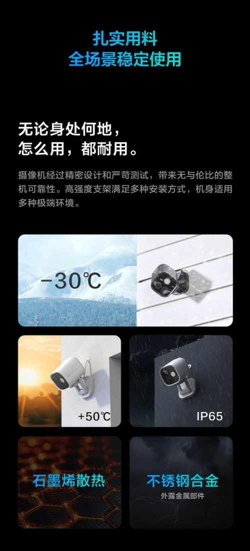 Aqara智能摄像机 G5 Pro通过IP65防水防尘认证,支持-30°C至50°C超宽温域运行,内置石墨烯散热模块与防雷击设计,轻松应对雨雪、沙尘及极端天气。