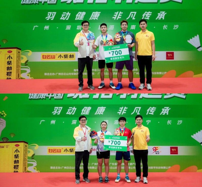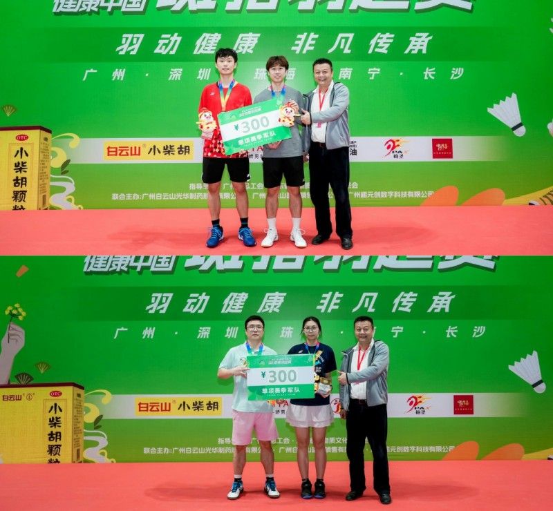 广州白云山光华制药股份有限公司营销管理部部长助理钟元璋先生、广州白云山医药销售有限公司广东省OTC经理伍勇先生分别为男双亚军“广州欧派装饰有限公司”队、混双亚军“劝你改名”队颁奖。