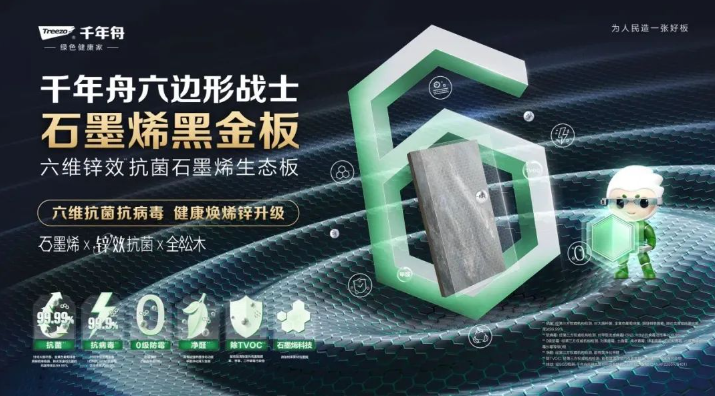 千年舟作为板材领域的领军企业,早在2015年就开始了对抗菌板材的研发,2020年推出光触媒抗菌板材,2022年将技术路线确定为“锌”系抗菌材料,成为了第一个将锌效抗菌技术应用于板材的品牌。历经技术迭代,产品升级,千年舟将新材料之王石墨烯加入其中,利用它优异的抗菌性,搭配进口优质全松木为基材,千年舟六边形战士——石墨烯黑金板终于问世。