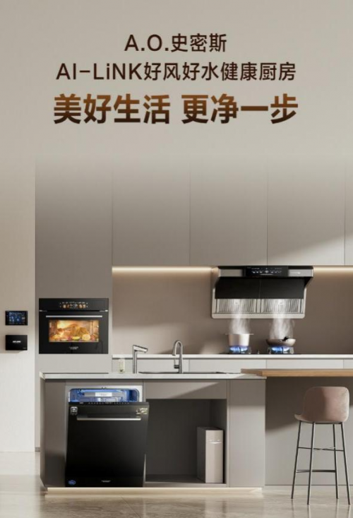 A.O.史密斯将百年工艺与AI结合,打造厨房“智慧大脑”——AI-LiNK系统。设备间数据互通,实现净水机与蒸烤机智能补水、洗碗机与油烟机协同净化,动态优化能耗。系统持续学习家庭习惯,让设备越用越“懂你”,从功能叠加升级为生态联动,延长设备价值周期。