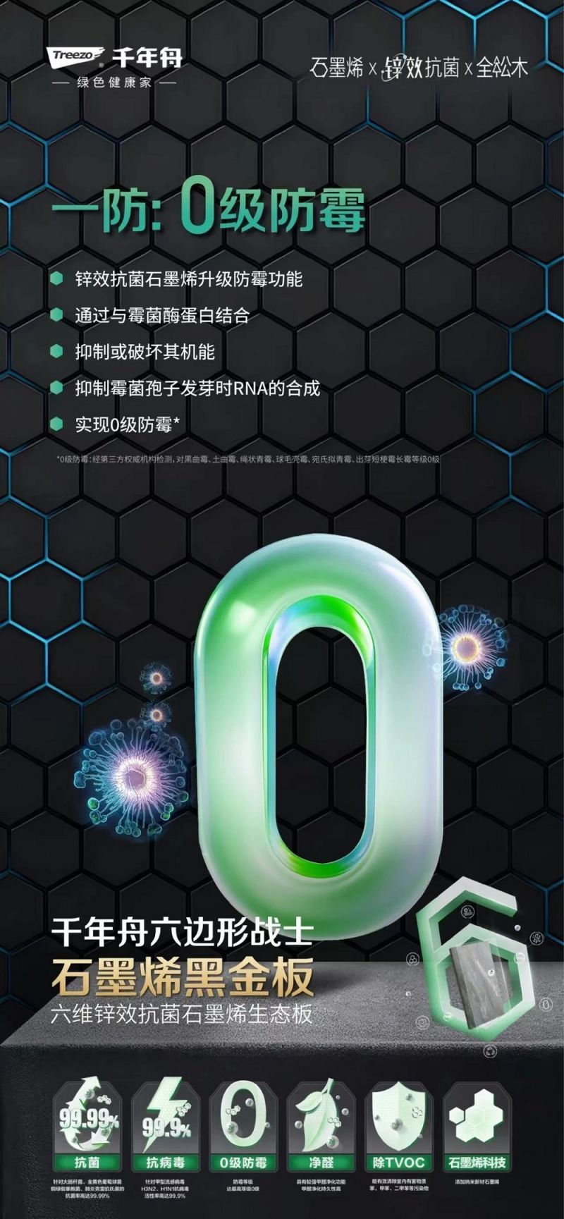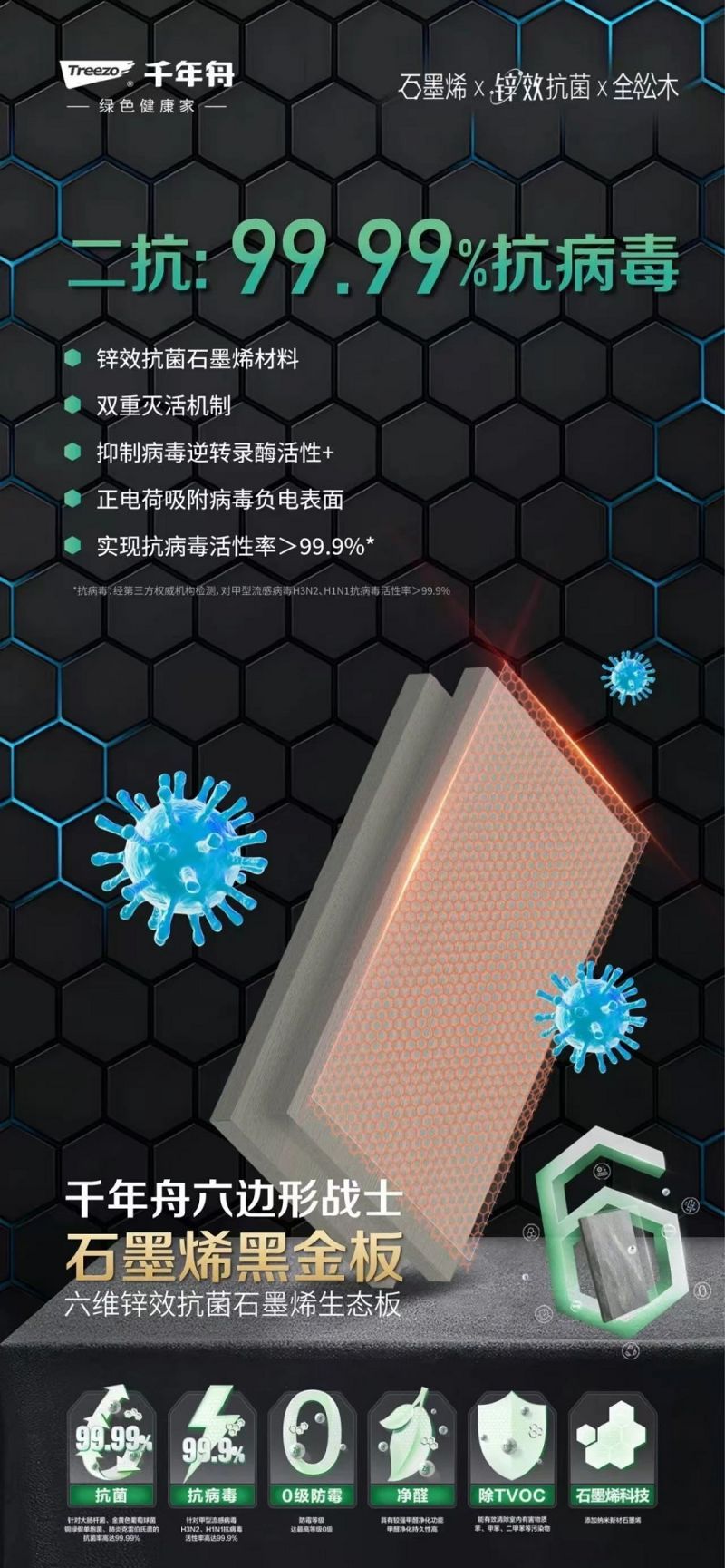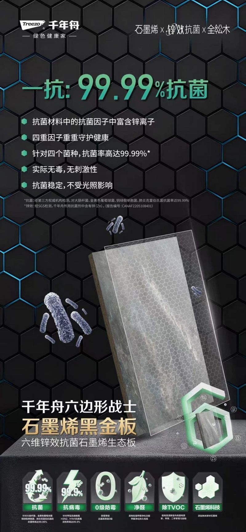 作为家居健康的隐形守护者,千年舟石墨烯黑金板将神秘的石墨烯科技与实用的锌效抗菌技术巧妙结合,为你打造一个抗菌、抗病毒、防霉、净醛、除TVOC于一体的六维健康防护圈,让家成为最安全的港湾。