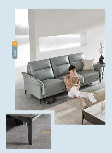 “云梦”系列的设计灵感源自中国传统美学中“云卷云舒”的诗意想象。沙发以“天青色”为主色调,搭配14公分轻奢亮枪色金属高脚,淡雅中透出低调奢华。设计师通过双层捏边工艺,塑造出如天鹅展翅般的飞翼扶手,线条灵动流畅,仿佛将云海翻涌的瞬间凝固于家居空间中。天然羽毛填充的扶手部分,不仅触感柔软透气,更在视觉上营造出轻盈的悬浮感,呼应“云梦之上,乐享韶华”的主题。
