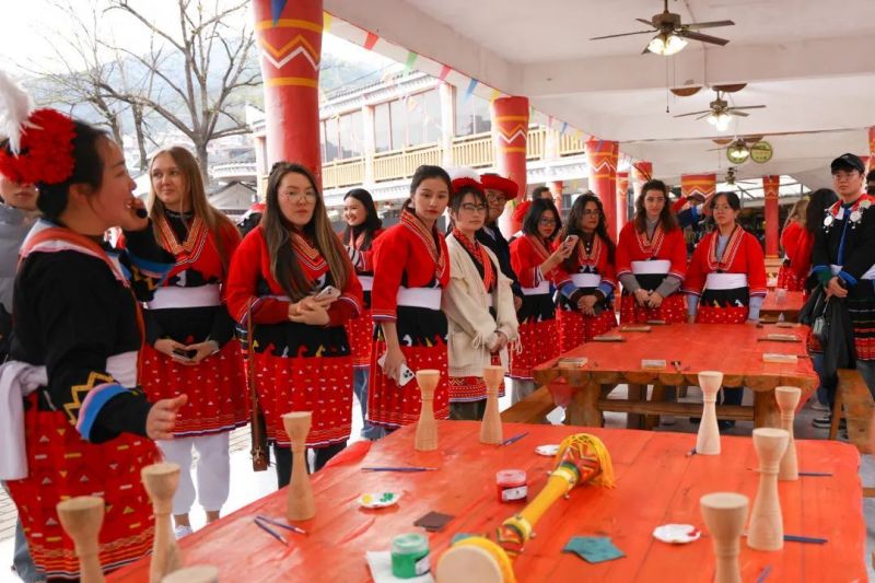 此外,留学生代表们还前往连南田家炳民族中学开展交流分享,与中学生们共同开展瑶歌、瑶鼓、板鞋互动体验。广东外语外贸大学与连南田家炳民族中学两校联合揭牌了“外国留学生移动小课堂”,通过拓展中学生国际视野,推动民族地区教育发展,促进跨文化融合交流。