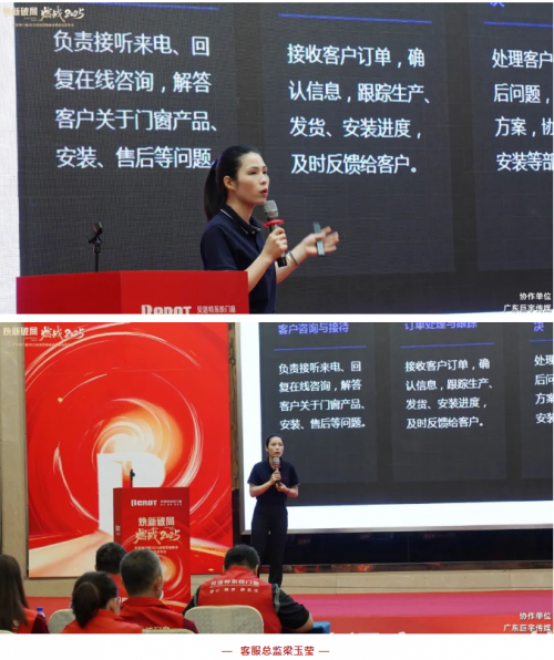 接下来是客服总监梁玉莹,凭借丰富的客户服务经验,为大家讲解门窗接单基本要素以及接单的注意事项。从下单前咨询、下单操作,到售后跟进,每个环节都围绕提升客户体验展开,涵盖售后响应时间、问题解决机制、维护保障以及简化的下单步骤,助力大家轻松享受优质服务。