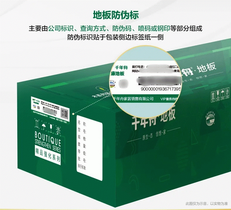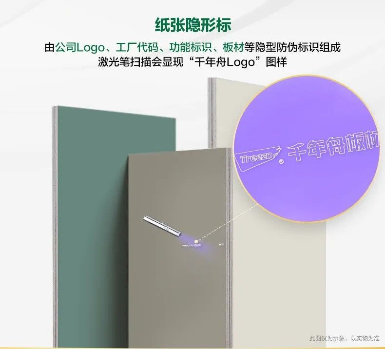 由公司Logo、工厂代码、功能标识、板材等隐型防伪标识组成,激光笔扫描会显现“千年舟Logo”图样。