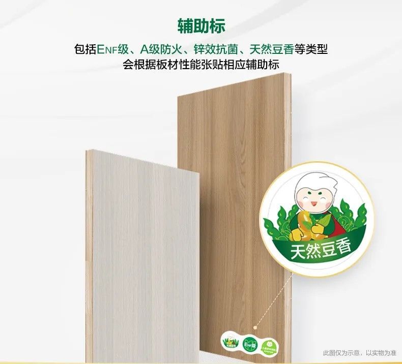 包括ENF级、A级防火、锌效抗菌、天然豆香等类型,会根据板材性能张贴相应辅助标。