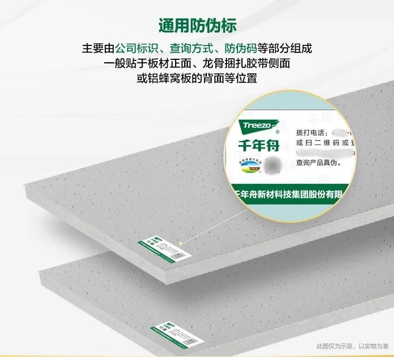 主要由公司标识、查询方式、防伪码等部分组成,一般贴于板材正面、龙骨捆扎胶带侧面或铝蜂窝板的背面等位置。
