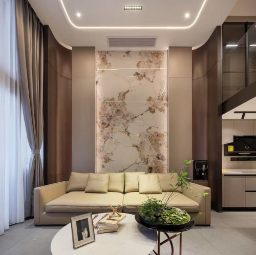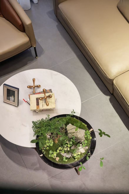 家的眷恋在此流动,索性放弃一切突兀繁复的修饰,生于自然的理石纹路会为空间带来故事,桌边的盈盈绿植,会让我们重新感受生命的本意。
