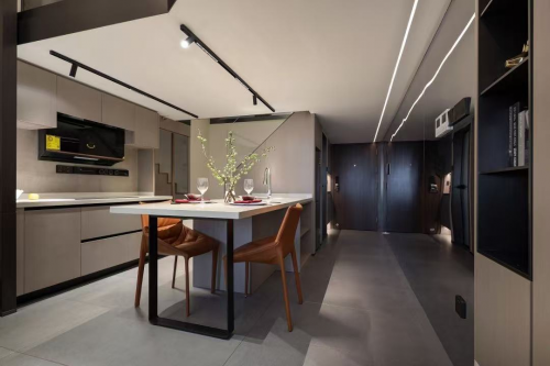 橙棕色餐椅环抱厨房空间的棱角,大片镜面墙设计,拉长进深有限空间,也将生活的温度清晰倒映。