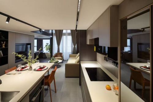 餐厨与客厅相连,满足亲友相聚互动,共享烹饪之趣。原本的餐区以西厨岛台代替,串联备餐、烹饪、就餐、陪伴,动线丝滑,让空间功能不再拘泥于用餐本身。