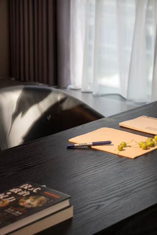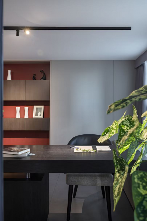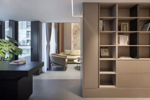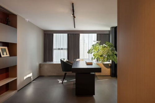 境随心变。在多功能办公区,乌色实木工作台和现代造型皮椅相得益彰,墙面则改造为书架形式,陈列着凸显整体空间质感的艺术装置。