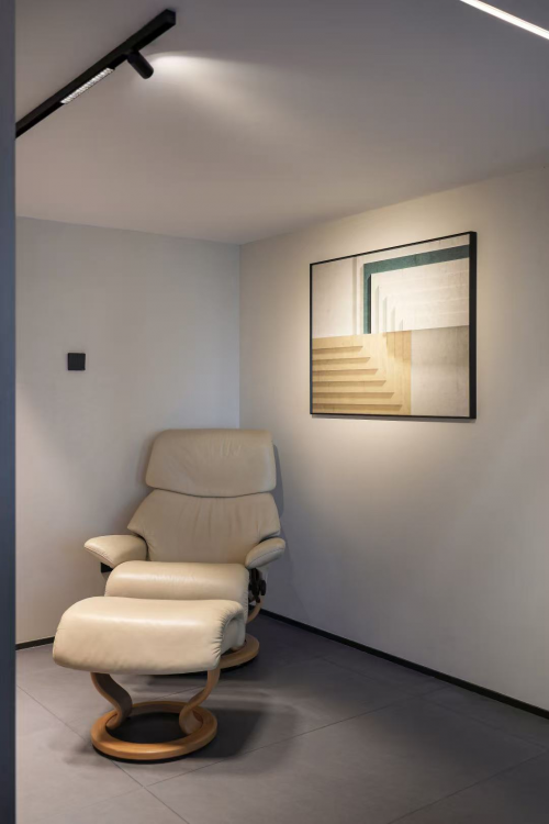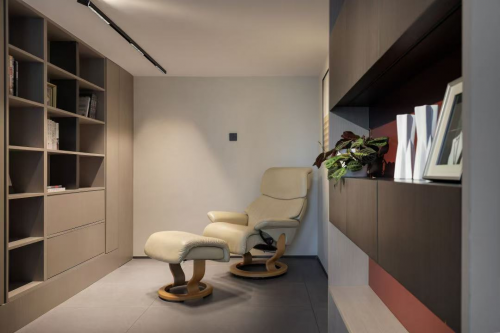 而在需要休憩或独处空间时,右转即可进入另一方小天地,书房整体采用米色基调,缀以松软柔和的奶油色躺椅,用原木、植物构建出清爽有序的冥想世界。
