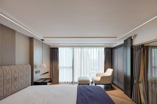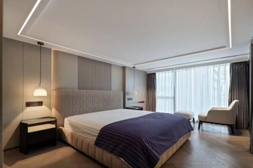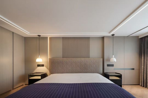 卧室以静谧的水泥灰色为基调,脚感舒适的原木地板及游走于空间的柔和灯光,不疾不徐地奏响无声夜曲,引领居者悠然舒适度过“无用”时光。