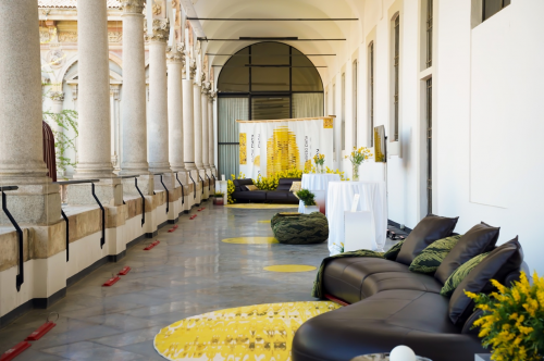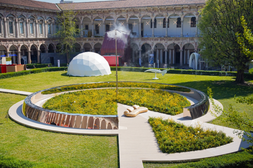 光合机构陈耀光创作的装置作品《礼物》,以意大利的金雀花、中国的迎春花和连翘花等春天花卉为素材编织的圆形花田焕发出勃勃生机,让畅游其间的参观者感受自然的馈赠。而不锈钢镜面折射的参观者、米兰大学建筑群以及自然景观将人代入一场陈耀光所说的“预谋的剧场”,在“家-天-地”的东方哲思中感受再创造的魅力。作品中可伸缩的阳光雨露机械装置成为点亮《礼物》蛋糕的“蜡烛”,所带来的交互体验也让人耳目一新。此外,陈耀光的这件作品还将可持续发展理念贯穿始终:装置采用节能灯及太阳能板、再生环保地面铺装等制作而成,不仅所有的材料可回收再用,花卉也可以与当地周边社区居民分享,延续生命的循环,人类对自然的友善和敬畏通过此次装置展展现地淋漓尽致。