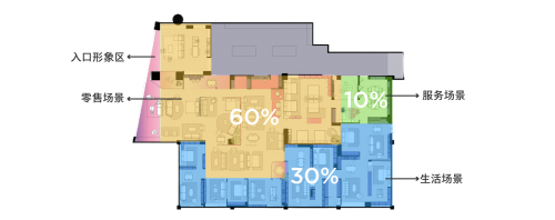 其中,入口形象区以高性价比小件商品陈列吸引非精准客户进店,完成初步引流与会员转化;零售场景通过专业单品展示激发即时消费,实现“逛买一体”的轻决策转化。核心的生活场景则聚焦精准客户,通过客餐卧一体化整家方案营造理想家居氛围。三层场景环环相扣,从流量捕获到深度转化,大大释放了家居零售的空间价值。