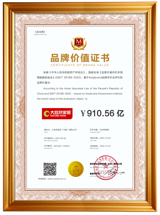 品牌,是企业的灵魂。从1995年创立伊始,大自然家居便以实木地板起家,积极探索市场新需求,深耕实木地板领域。早在2000年,大自然地板就成为实木地板国家标准、行业标准的起草单位之一,为行业的规范化发展做出了突出贡献。2024年大自然家居更是凭借 910.56 亿的超高品牌价值,2018年--2024年连续 7 年荣登 “亚洲品牌 500 强”。这一傲人成绩的背后,是大自然多年来始终肩负着满足全球消费者理想居住环境的使命,以品牌为基石,不断在产品研发、设计、制造等各个环节深耕细作,持续创新。正是这种对品牌的执着与坚守,推动着民族家居产业迈向高质量发展的道路,也为大自然家居在地板品类销售中拔得头筹奠定了坚实基础。30年风雨共济,欲见高楼起,需向难处寻。荣誉背后,大自然家居拥有十足的底气。