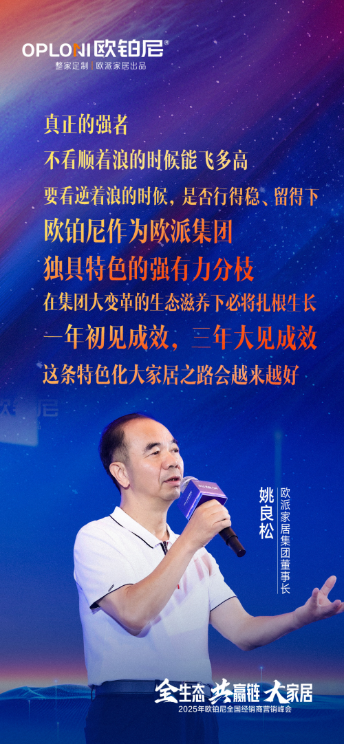 会上,欧派集团董事长姚良松先生明确指出,真正的强者,不看顺着浪的时候能飞多高,要看逆着浪的时候,是否行得稳、留得下。欧铂尼作为欧派体系内一支茁壮成长的分支,必将在集团的滋养下扎根生长,一年初见成效,三年大见成效,这条特色化大家居之路会越来越好。