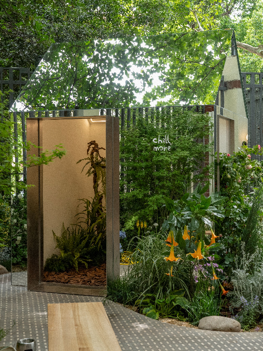 不追求突兀和刺眼的表达,chillmore宝庆路店将门店与街区的自然融合做到极致。在闹市区构建了一座真正的“绿洲”花园。花园内种植了四季桂、马鞭草等与产品香调一致的植物,藤蔓正沿墙生长形成天然屏障。特设流浪猫饮水点,践行品牌对生命的温情关怀。在花园中央,远看不明显但时候走近了会发自内心的小声惊叹:原来这里被镜面包裹了一个小屋!这个可容纳1-2人的私密空间名为“镜屋”,在不同的角度观看外部镜面,会折射出树影斑斓的绿意、繁忙的街景,在一个特殊的角度还可以看到chillmore宝庆路店的全景。这个主题装置就像是在邀请用户以多元视角发现生活之美。
