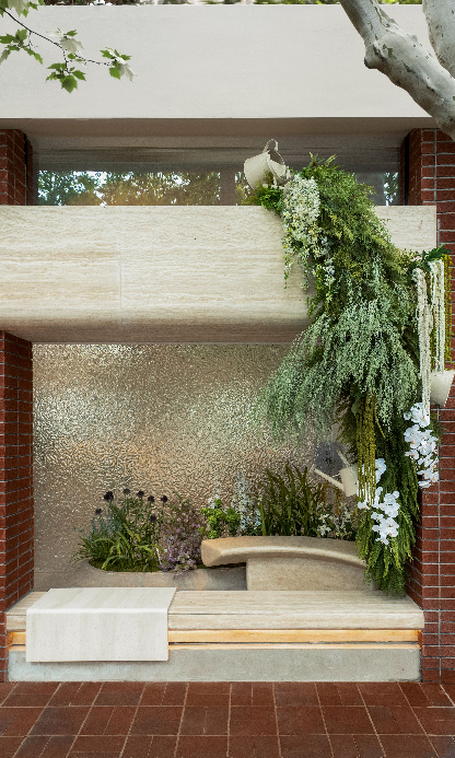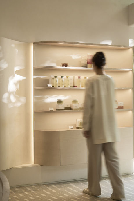 门店内的异形石材以柔润线条重塑,呼应产品“软化生活严肃感”的理念,洒落在门店中像是石头肤感的云朵,轻盈而柔和。在地面上近万块手工烧制的小砖经激光定位与人工铺贴,形成从密到疏的渐变排布,恰逢chillmore宝庆路店从店内到花园的纵向分区逐渐扩散,与不断重复的弧形天花板相互映衬,将嘈杂室外刚进入的紧绷情绪逐渐扩散松懈,行成一个到最终回归室外花园的自然松弛的状态过渡。而位于互动体验区域巨大的一体成型定制洗手台可以保留生产中的自然气泡,仿若沐浴时玻璃上的水痕,将日常仪式升华为与生活息息相关的艺术体验。