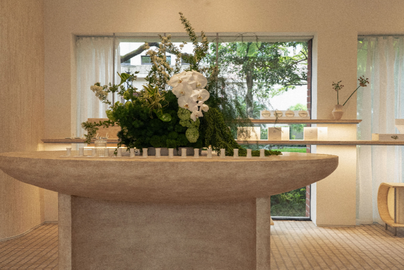 "我们不想让消费者在琳琅满目中迷失"品牌市场负责人刘骏翼表示,"通过渐进式感官引导,帮助用户先与香气产生情感联结,再自然过渡到产品体验。"chillmore宝庆路店内的产品展示前区以情绪舒展的空间香氛松散陈列为主,转身即可抵达居家和出行场景的香挂、香水和唇油展示区。随后大量的空间留白给到了反射宝庆路路牌的装饰镜面和休憩沙发,在门店最后区域才是chillmore最经典的身体和头发洗护产品的侧立陈列。展示伴随着巨大的定制产品体验洗手台,以及一个每天都有绵密泡沫的浴缸。在这里,已经临近门店内部与花园的交界点,稀疏的手工地砖与弧形天花板的末端连接到室外,让产品的体验和选择也变得心旷神怡。