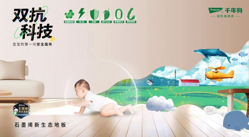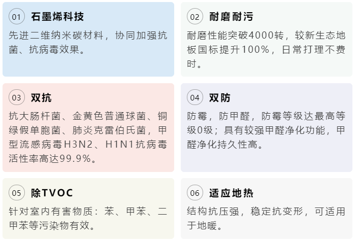 石墨烯新生态地板创新融合高科技石墨烯材料与锌效抗菌技术,通过石墨烯表面活性基团催化环境中的水氧分子生成强效活性氧,加强杀灭细菌和病毒效果。产品集成六维防护(石墨烯、双防‘0级防霉,防甲醛’、双抗‘99.9%抗菌,99.9%抗病毒’、除TVOC、耐磨耐污、地热适配),ENF级环保基材杜绝甲醛隐患,耐磨性较常规新生态地板提升100%,稳定性强抗变形,精准服务高端住宅、母婴及养宠家庭,以“健康科技+性能突破”定义高端市场标杆。