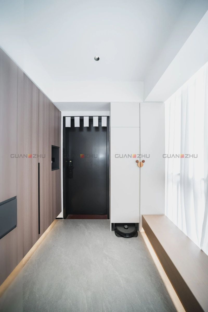 屋主Aison在进门处精心设计了一块落尘区,他解释说:“这样设计是为了营造一种仪式感,在视觉上提醒回家的人该放松下来了。”冠珠产品的多元应用满足了这次设计巧思的呈现。玄关处融合铺贴冠珠微光石流沙-墨灰与冠珠微光石流沙-砚灰两款产品,深色砖隐匿灰尘,浅色砖提亮空间,近看渐变过渡,远看浑然一体,美观又实用。