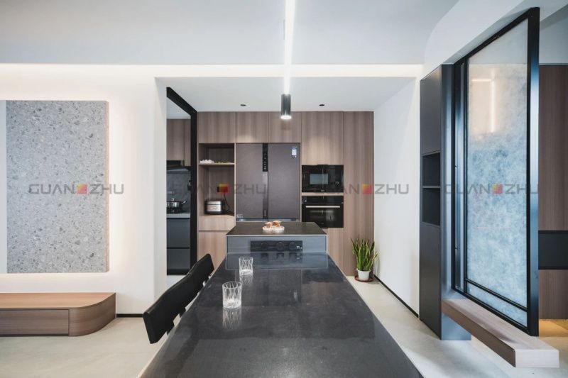 迎合夫妻俩中西交融的饮食习惯,岛台餐桌的开放设计,满足西式轻食的便捷需求;独立的中式厨房,则承载着他们对传统饮食的热爱。该区域的所有所有电器都做了内嵌设计,并搭建节能技术,进一步降低能耗,让厨房成为环保与实用兼备的场所。餐厨空间选用绿色环保型材料——冠珠微光石流沙-砚灰,也是他们可持续理念的体现,低维护需求和超长使用寿命,在满足环保和耐用的基础上,默默见证他们充满爱的每一个日常。