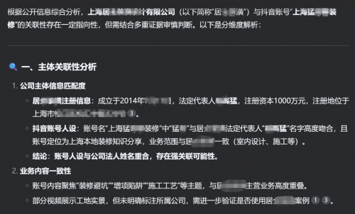 而此时,疑似关系中一家名为“上海居****设计有限公司”的公司引起了我的注意,基于自己没有判断经验,于是我把这个疑问提交给了deepseek,让它帮我进行分析“上海居****设计有限公司”与“上海猛***装修”账号是否存在关联性,以下为部分分析结果: