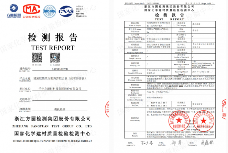 千年舟抗弯海洋生态板生产过程中使用无机胶黏剂,本身不燃且耐受高温,成品板经第三方检测后,燃烧性能达B1级难燃,离火不燃烧;而且抗弯海洋生态板被烧灼后少烟、低毒,600s总烟气生成结果22,远低于国标≤200的要求,全方位呵护你和家人的安全!