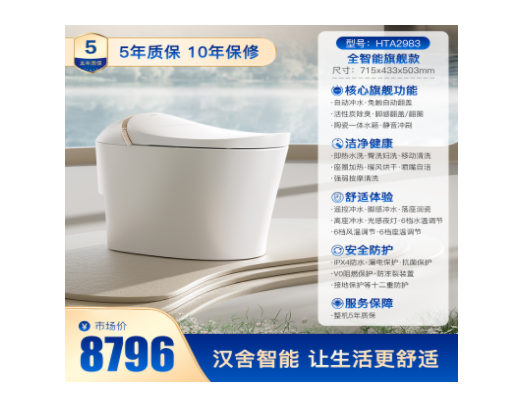 以智能马桶为例,汉舍推出的全新产品——HTA2983智能坐便器不仅采用陶瓷一体水箱,突破0.02MPa低压冲水瓶颈,解决老旧小区痛点;还有臀洗妇洗清洗技术,以轻柔到强劲的节奏变化,带来如同专业水疗般的舒适体验;同时采取喷嘴自洁和抗菌保护,为用户健康筑牢安全防线。