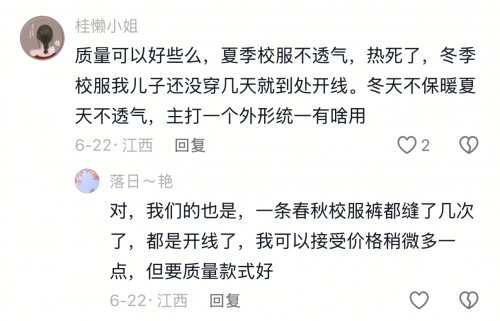 校服是孩子天天穿的“第二层皮肤”,不是搞形式主义的道具。家长掏钱,就该校长自己选择款式、选择审美、选择品质。作为家长我们不会一味追求低价,19.9元的夏季校服我可不敢买!哪个孩子不是全家的重点保护?哪个家长愿意用孩子的健康,去换所谓的“管理便利”。甲醛超标的校服,穿在身上的是衣服,悬在心上的是刀子啊!