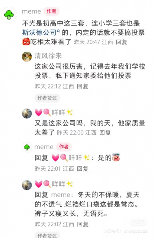 监管失效:统一需求催生“地摊校服”“后备箱校服”等仿冒品,甚至都无“仿冒”可言,长得一样都称之为“校服”,都可以销售。线上销售隐蔽性加剧追溯难度,2024年深圳虽推质量监管码,但在分散的销售网络中形同虚设。