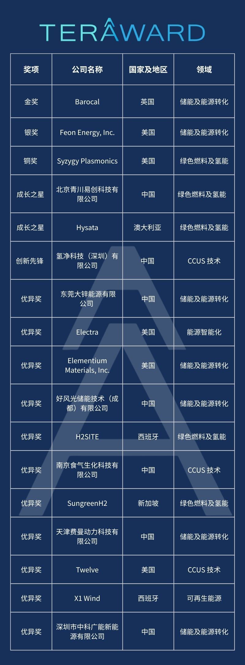 除金、银、铜奖外,大赛还设置了多个奖项,其中“成长之星”由澳大利亚的Hysata及北京青川易创科技有限公司获得;“创新先锋”授予氢净科技(深圳)有限公司。此外,来自中、美、西班牙、新加坡等国家的11家企业荣获“优异奖”,涵盖储能及能源转换、绿色燃料及氢能、CCUS技术、能源智能化、可再生能源等多个领域。