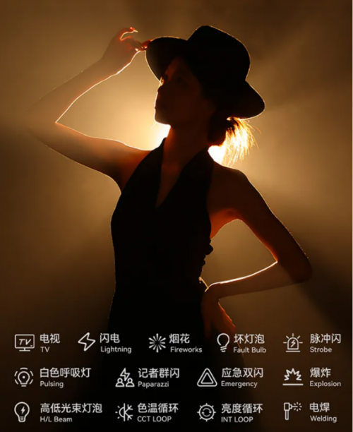 烟花、坏灯泡、记者群闪等13 种自带光效模式更是为创意提供更多灵感,多样动态光效捕捉每一个唯一瞬间,一灯即可营造多种创意场景,轻松实现从构思到落地的无缝衔接。