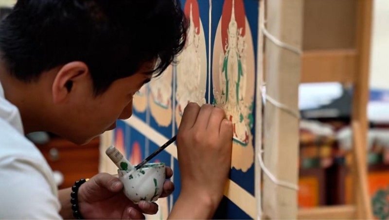 嘉绒唐卡之美,源于对极致工艺的坚守。唐卡的绘制要求十分严苛,嘉绒传统唐卡在制作画布时,采用一种特殊的泥土,当地人称之为“比曼”,和骨胶调制好以后均匀地涂抹在绷紧的画布上。画布晾干打磨好后即可开始构图起稿、炭笔淡墨勾勒、渲染、平涂、勾线、描金(铁线描、高古游丝描、柳叶描、行云流水描等传统手法)、开眼等一整套工艺流程。一幅唐卡,需要绘制几个月甚至一年的时间,在时间与匠心的沉淀中,艺术成为了永恒。