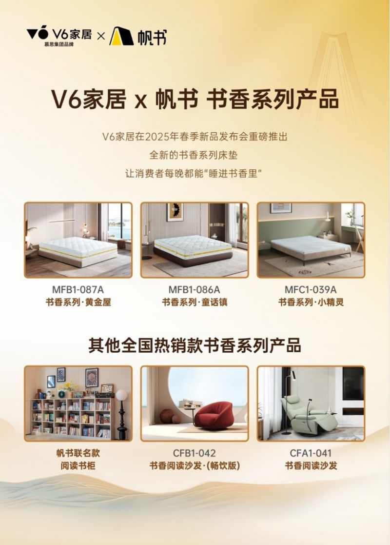 自2022年开始,慕思集团品牌V6家居就与中国新阅读开创者帆书展开了深度合作。双方不仅联名开发了书香阅读沙发、书香系列床垫、联名款阅读书柜等适配家居阅读需求的热门单品和家居阅读空间一站式解决方案,还陆续举办了书香家居文化节、书香下午茶等一系列倡导阅读文化的活动,并持续打造城市书房、构筑公益阅读空间,助推阅读文化传播常态化、多元化、立体化。
