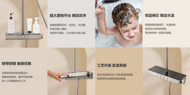 L系列淋浴柱,超大置物平台,解放双手。宽敞的置物空间,洗发水、沐浴露、护肤品随心摆放,告别手忙脚乱,让沐浴时光更从容。钢琴按键,触感优雅,灵感源自钢琴的优雅设计,搭配防滑旋钮,操作简单流畅,老人小孩都能轻松上手。恒温阀芯,稳定水温。搭载智能恒温阀芯,水温恒定,告别忽冷忽热的烦恼,享受始终如一的舒适温暖。