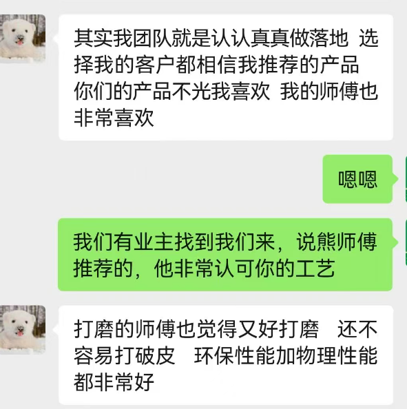 通过我购买卓玛腻子粉的业主,我做过一些调研,反馈都非常好,起初我还担心南方配方到北方是否适应,但发现辽宁、河北、江苏、湖南地区的业主,对产品评价非常高,腻子精白细腻,没有味道,很结实,硬度好,师傅也反馈批刮爽滑,打磨不脱壳不掉皮,师傅也很喜欢用,施工效率提升,没有客诉风险,光着膀子施工都没有问题,粉掉在身上没有刺激性,在施工现场吃饭、午睡都没问题,但一般的粉就不能这么干了。