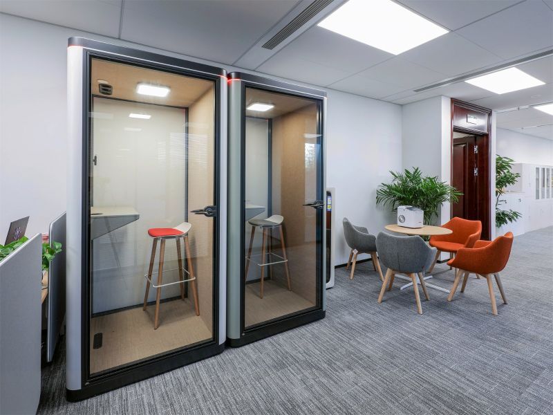 在开放式空间中,Halo 2 静音舱创造出一片独立的空间。其隔音设计具有双重优势:舱内使用者隔绝外部噪音,可以心无旁骛地进行线上会议或者电话;在舱外开放式空间的同事也能畅所欲言,彼此互不干扰,提升空间的协作效率。